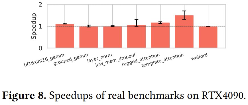 Triton 未采用论文中描述的优化代码生成。例如,布局转换始终通过共享内存进行,对高效硬件原语的使用有限。