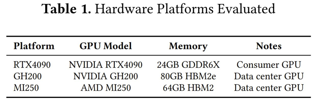 需要注意的是,由于硬件限制,并非所有基准测试都适用于每个平台。例如,某些基准测试需要仅在 GH200 上才有的大型共享内存,而一些核使用的张量描述符依赖于 TMA 引擎,而 RTX4090 和 MI250 上均不支持 TMA 引擎。