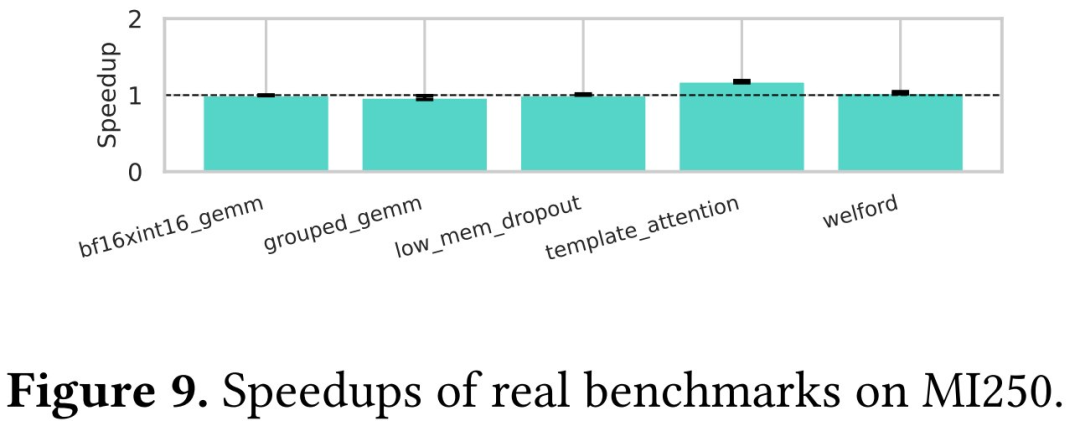 由于每个基准测试包含多个输入,总计 420 个案例,因此他们使用了误差线(error bars)来表示每个基准测试的最小和最大加速。