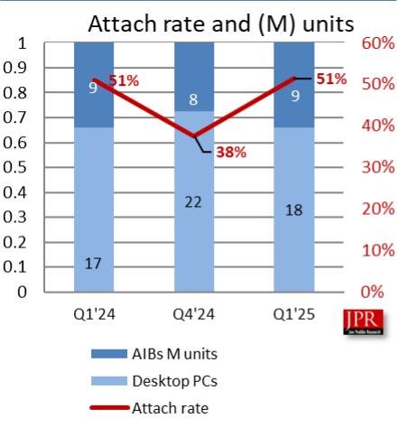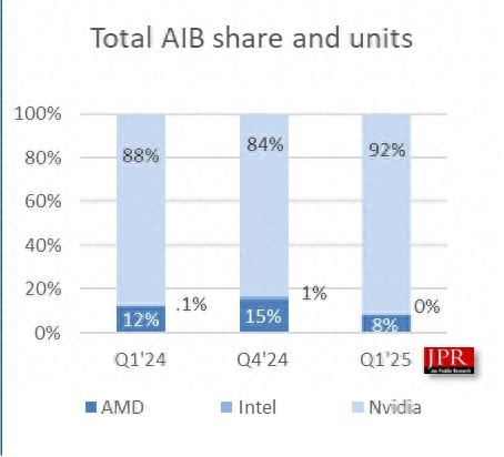 NVIDIA的份额在2025年第一季度增长了8.5%(达到了92%),这对于该公司来说是一个巨大的增长,此前该公司的市场份额曾下降到84%。