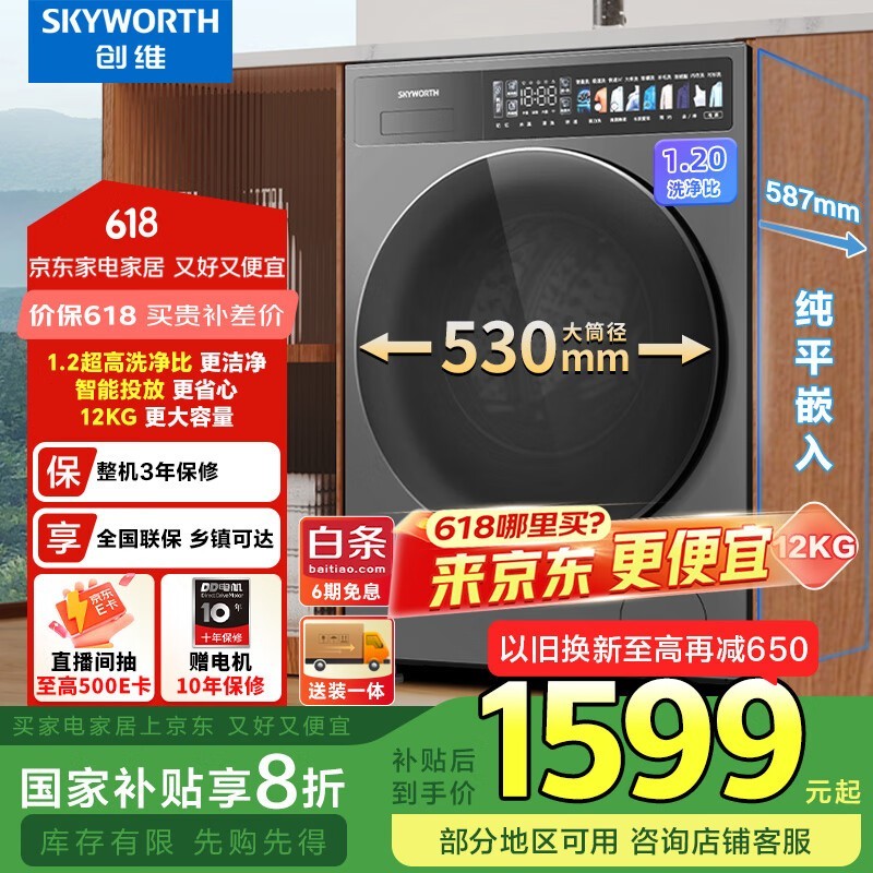 创维12公斤滚筒洗衣机,京东活动价低至1432元