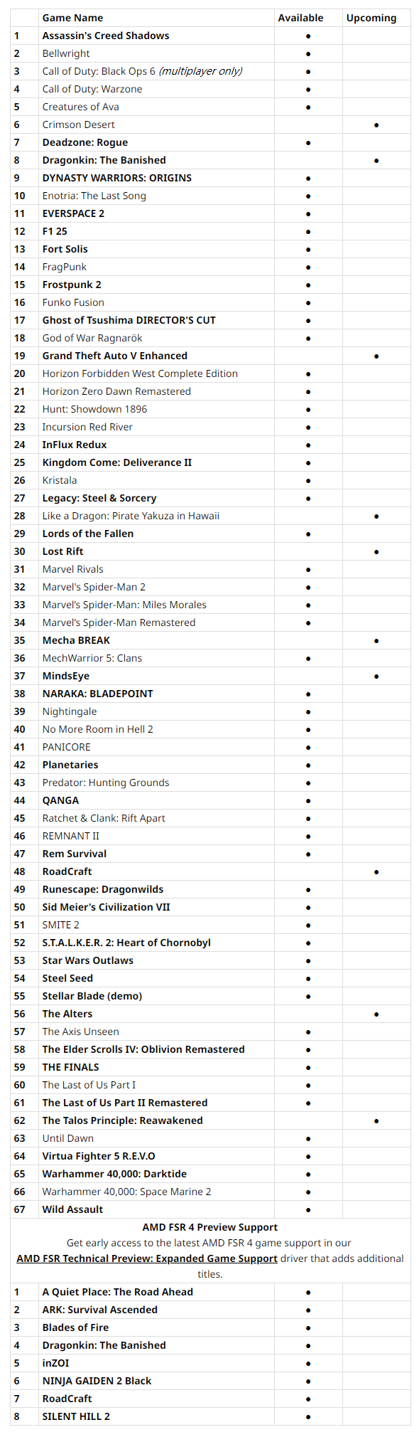 最大亮点当属FSR 4游戏一下子新增了14款,从而增加到67款,另有8款预览支持,合计已达75款。