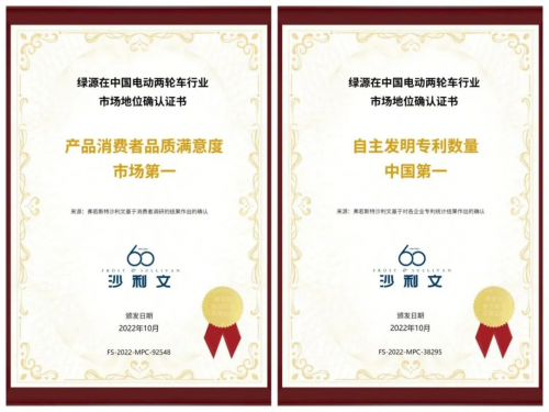 权威认证也接踵而至:中国轻工业联合会连续四年授予绿源科学技术奖项,“液冷集成电机”更是加冕“科学技术发明奖一等奖”;全球增长咨询公司弗若斯特沙利文授予绿源“全球液冷电机开创者”、行业“自主发明专利数量中国第一”、行业“产品消费者品质满意度市场第一”等多重认证。