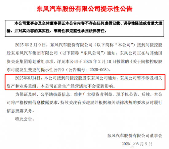 随后东风股份也对外发布公告,称其接到间接控股股东东风汽车集团有限公司通知,东风公司暂不涉及相关资产和业务重组,东风股份的正常生产经营活动不会受到影响。这也意味着,自今年2月9日开始对外发布的东风、长安合并重组事宜目前正式告一段落。