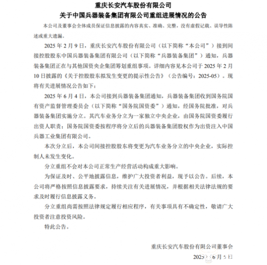 长安汽车公告显示,经相关部门批准,将对兵器装备集团实施分立,其汽车业务,长安汽车的间接控股股东将变更为汽车业务分立的中央企业,实际控制人未发生变化。
