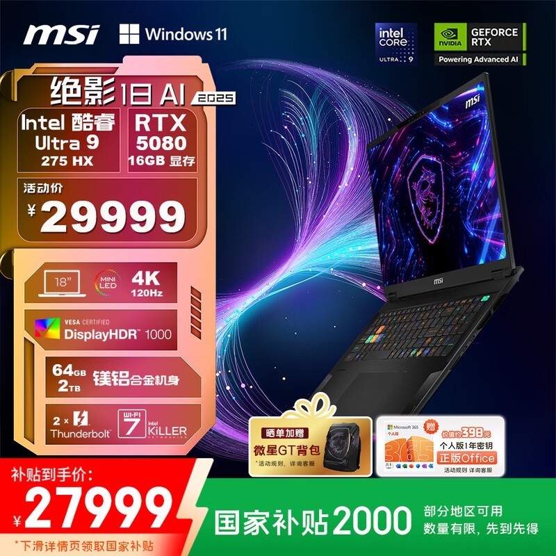 微星绝影18 AI游戏本20%补贴后27999元