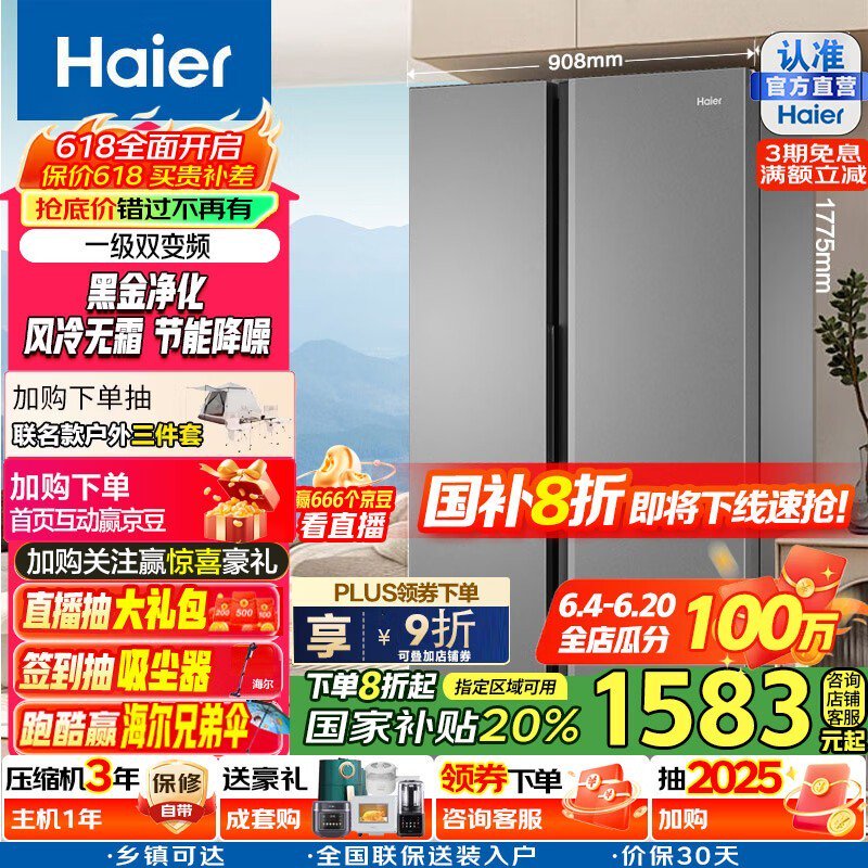 海尔539L风冷对开门冰箱京东低至1343元