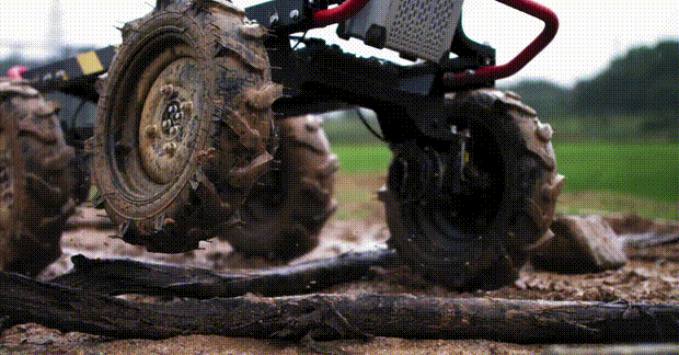 比如说 R100 无人车设计成了四个轮子都可以被独立驱动,这样做不仅可以实现 0 米的转弯半径,也能增强无人车的越野能力,因为很难预判在作业时,会不会遇到田垄、石头等意想不到的障碍物,而且有些作物甚至有地面保护的要求,无人车在上面不能把表土压伤,这样独立控制就可以加大无人车的转弯半径来减小对地面的伤害。