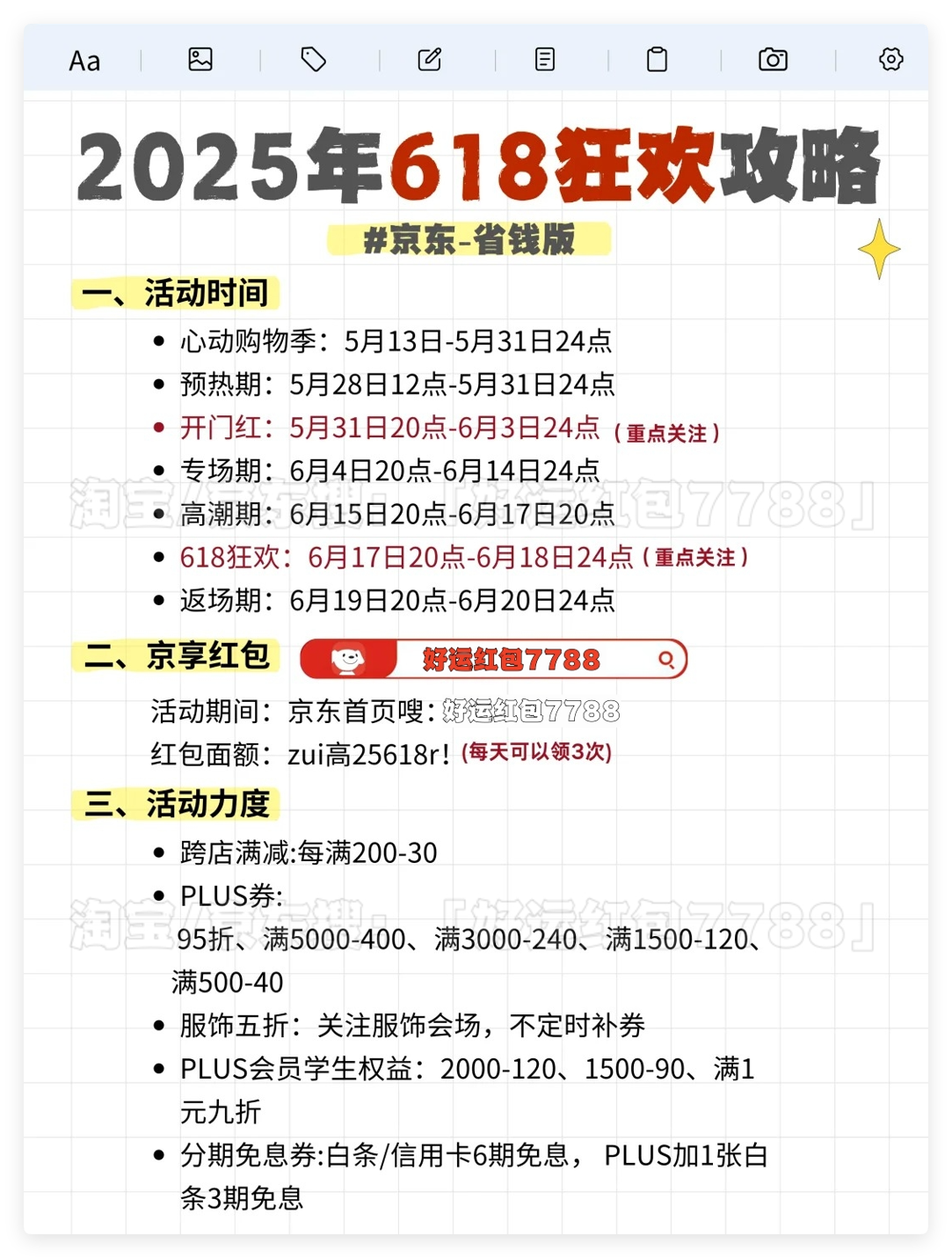 首先,划重点!今年天猫/淘宝和京东的618红包口令全都是「好运红包7788」要记住!领的红包大小和你搜索的什么口令有关的!这个双平台通用口令包领到大的!记得每天去领!