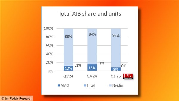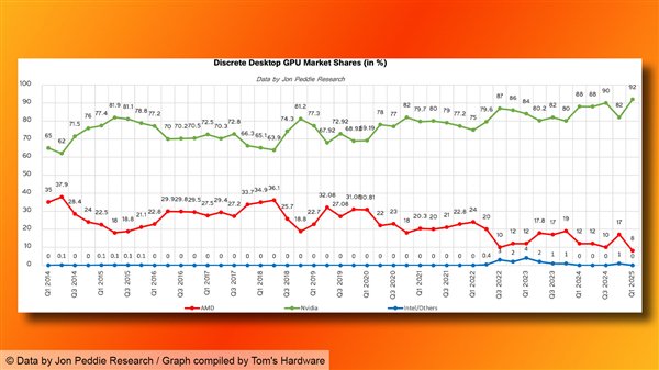 统计数据涵盖今年首季,囊括颇受好评的Radeon RX 9070 XT(3月6日发布)。但英伟达的PC显卡份额由82%增长至92%,AMD则由去年年底的15%跌至今年首季的8%。