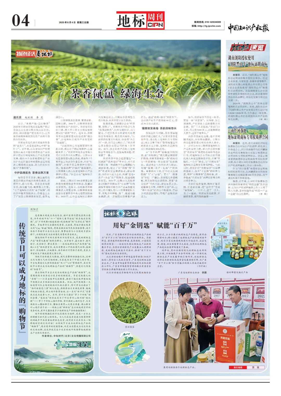日照绿茶是代表日照城市形象的“金名片”,也是老百姓心中的“金叶子”。近年来,山东省知识产权局坚持以高水平建设地理标志产品保护示范区引领地理标志产业高质量发展,组织召开全省地理标志产品保护示范区建设和地理标志运用促进工程现场交流会,助力打造乡村振兴“齐鲁样板”。