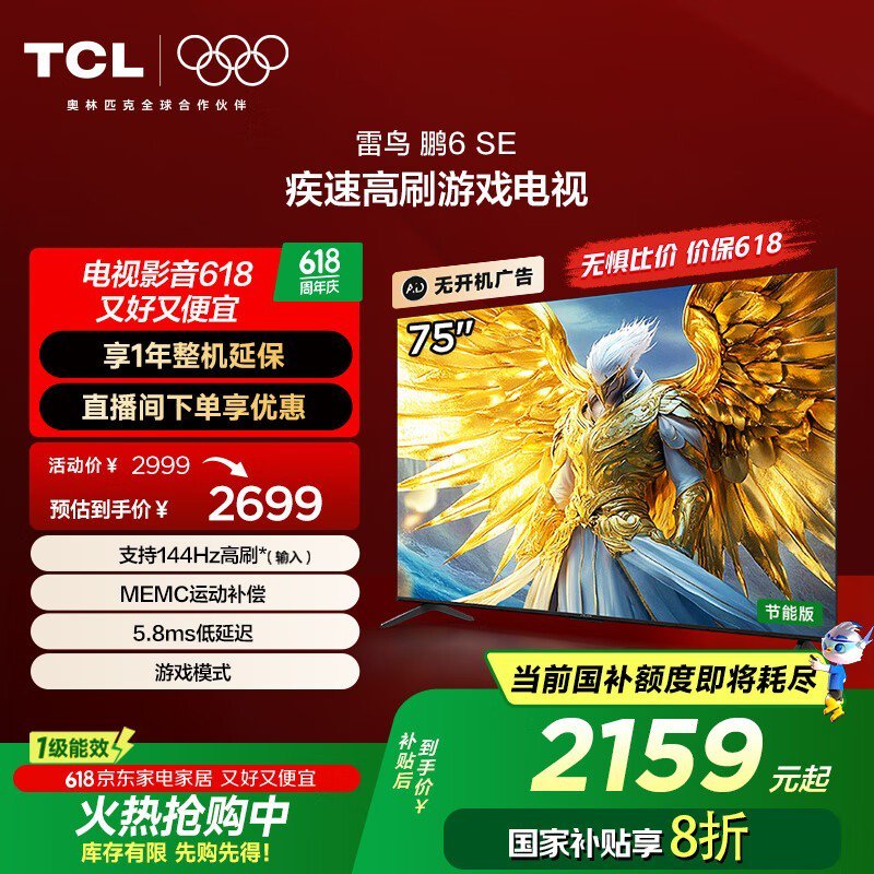 雷鸟鹏6SE 75英寸4K电视钜惠,补贴后低至1659元