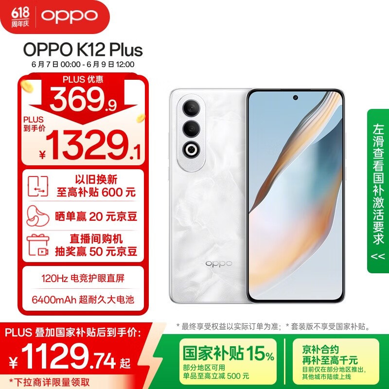 OPPO K12Plus 5G手机雪峰白限时特惠1122元