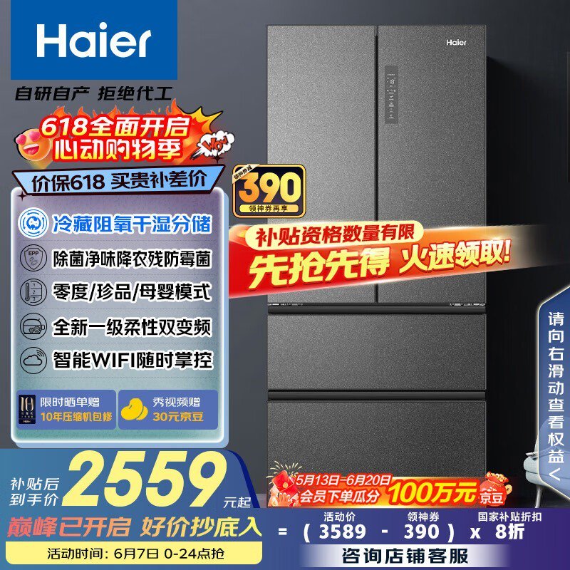 海尔清韵系列510L冰箱 到手价2485元