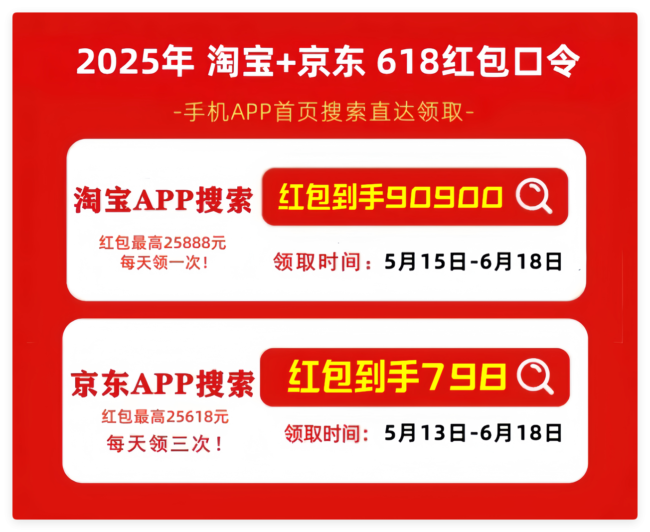 红包连领:京东搜“红包到手533”(每日3次)、淘宝搜“红包到手99222”(晚8点加码),最高抵25888元。