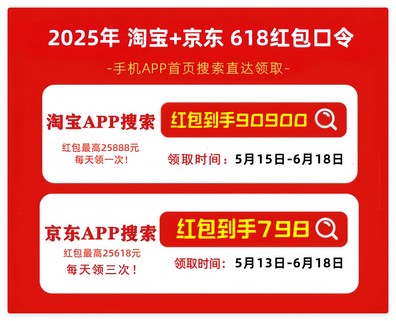 首先,划重点! 今年京东的618最新红包口令是:京东app搜「红包到手533」可叠加国家补贴!每天领3次,最高25618元!家电家具国补的领取方法是:京东APP搜「家电599」国补最高立减2000元,,手机数码的领取方法是:京东APP搜「手机599」或「数码599」最够补贴500元。