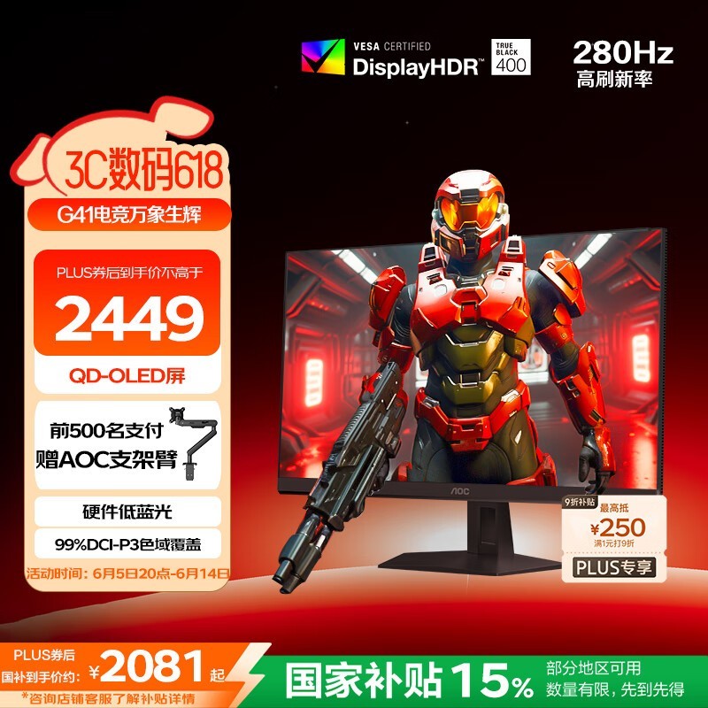 AOC 26.5英寸QD-OLED电竞显示器2K 280Hz高刷屏