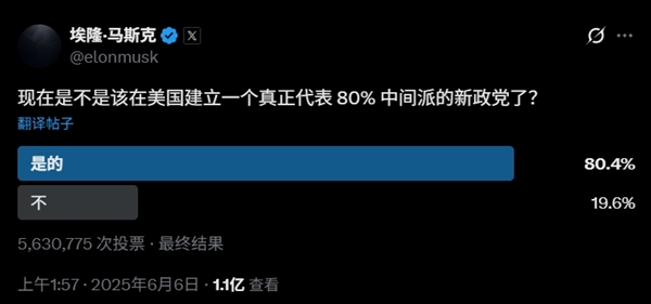 马斯克问道:“现在是时候在美国创建一个真正代表80%中间派的新政党了吗?”,最终获得563万名用户投票,有80.4%的网名支持力挺,并起名为“美国党(America Party)”。