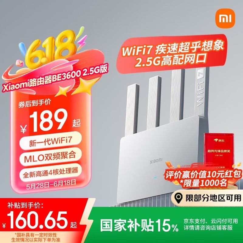 小米Xiaomi BE3600路由器京东优惠低至132元