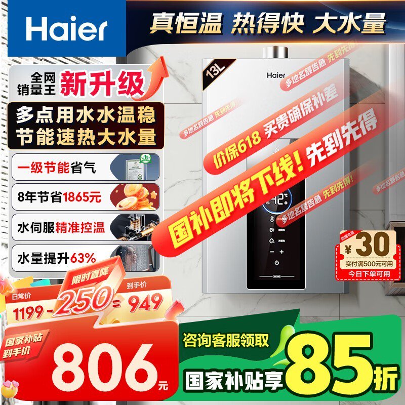 海尔13L燃气热水器大容量高效恒温智能调控京东特价756元