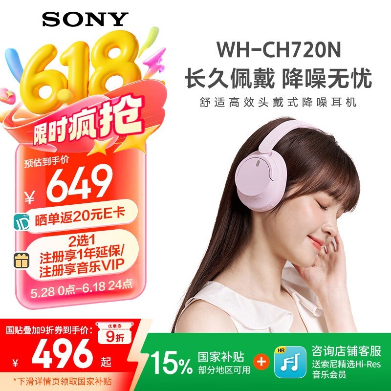 索尼WH-CH720N粉色耳机限时特惠405元