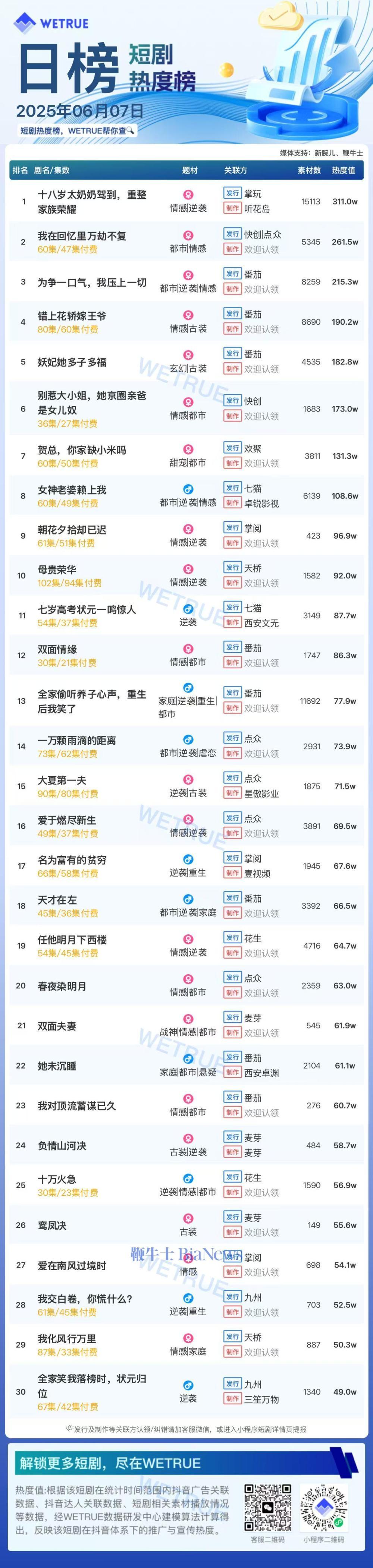 1、本日榜为WETRUE短剧数据公司提供,新腕儿和鞭牛士提供联合支持。