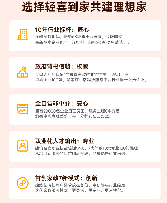 于2015年成立的轻喜到家,已在家政行业耕耘了10个年头。作为一个拥有着浓厚互联网基因的家庭服务平台,轻喜到家克服管理成本攀升的困难,长期推行直营管理模式,通过打造管控系统、确立服务规范等方面建立品牌信誉,构筑了多方共赢的服务生态,业务覆盖全国68城,累计服务逾千万家庭,真正成为“品质服务”的代名词。