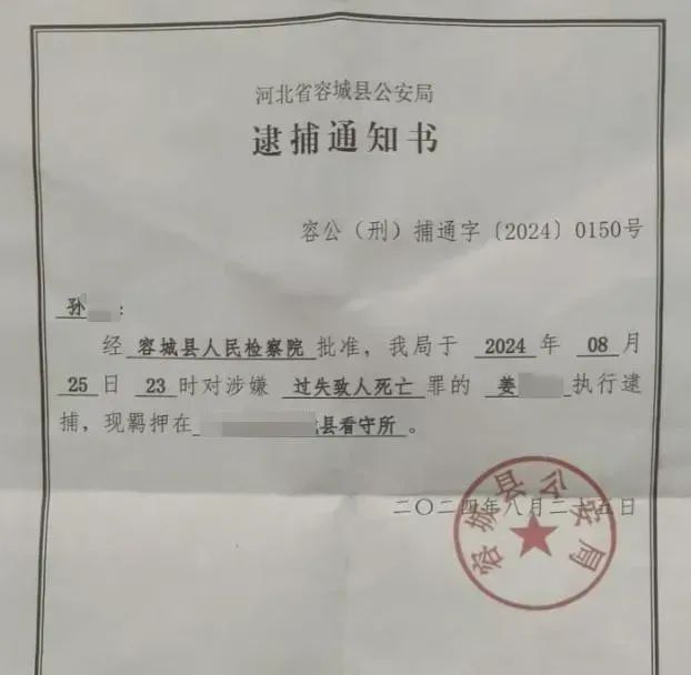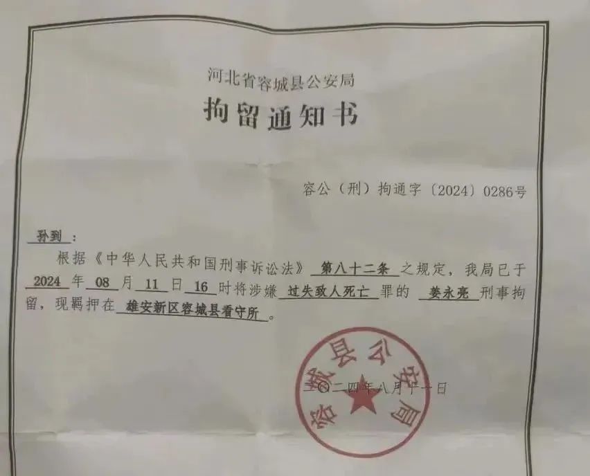 2024年8月25日,姜永亮因涉嫌过失致人死亡罪,被容城县检察院批准逮捕。这也就意味着,司法机关基于一定证据证明他有犯罪事实。