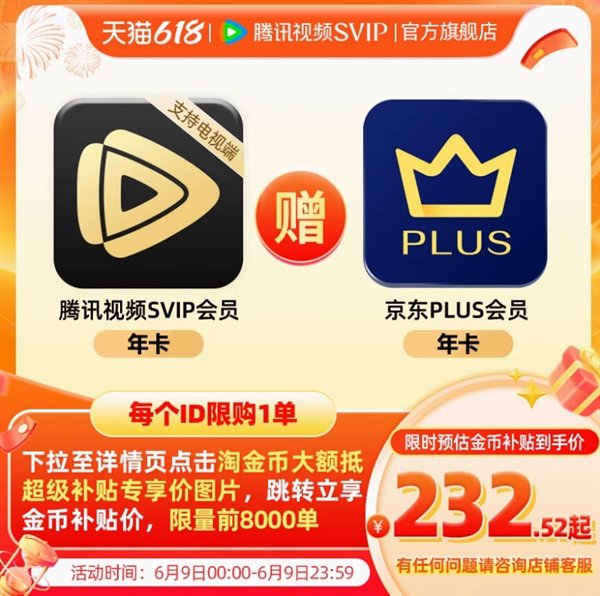 另有腾讯视频VIP会员年卡(支持手机,电脑和PAD)+京东PLUS会员年卡,限时168元。