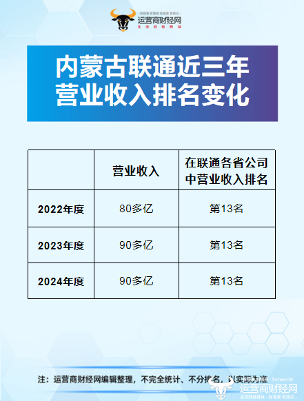自2022年度以来,内蒙古联通在集团内部的营业收入连续三年都保持在第13名的位置,其在北方十省公司中也位于第7名,在东北地区则仅次辽宁联通,发展地位不低。