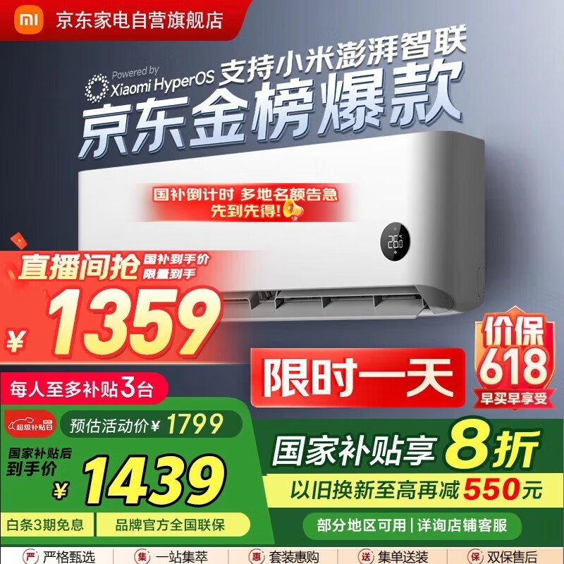 米家1匹壁挂空调,京东优惠后仅需1262元