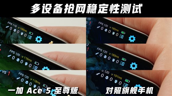 而在同样的状况下,一加Ace 5至尊版的时延则没这么严重,虽然也来到了100ms+,但游戏操作还算是在可控制的范围内,可能也就遇到团战时画面响应会慢1-2帧,不过在如此拥堵的网络环境中,一加能够做到这样的抢网表现,这网络稳定性确实是行业顶级水平。