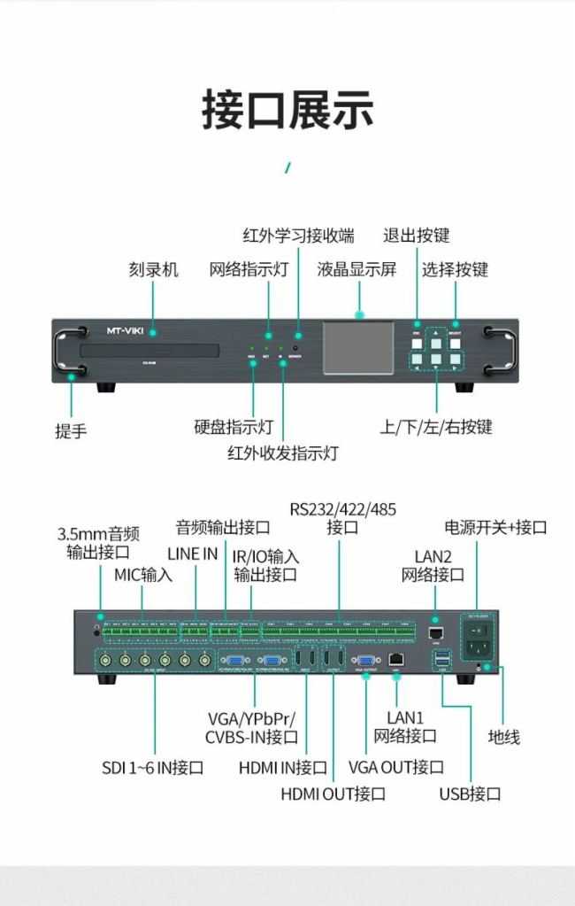 1、无缝混合矩阵:支持6路SDI+2路HDMI(4K输入)+2路VGA,多信号源自由切换。