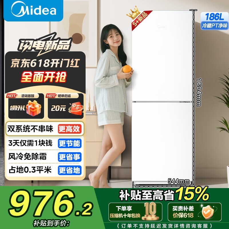 美的MR - 195WE双门冰箱,原价1199现976.2