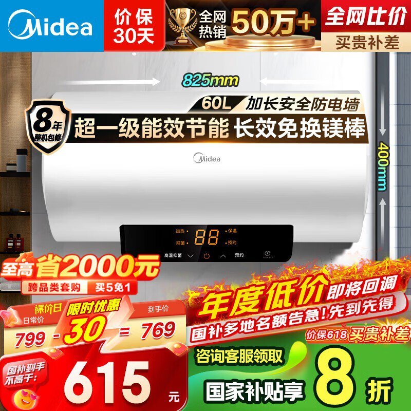 美的50升储水式电热水器,到手价501元