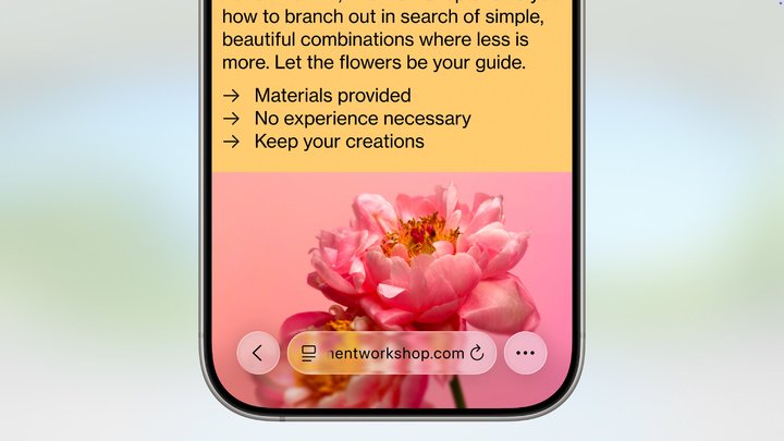Solarium UI 进入了 Safari 浏览器中,在 iOS 26 上,Safari 可以全屏观看网页,而网址栏、分享、刷新等功能键,则会以液态玻璃的形态悬浮于屏幕底部,尽可能不影响网页的沉浸浏览体验,召之即来,挥之即去。