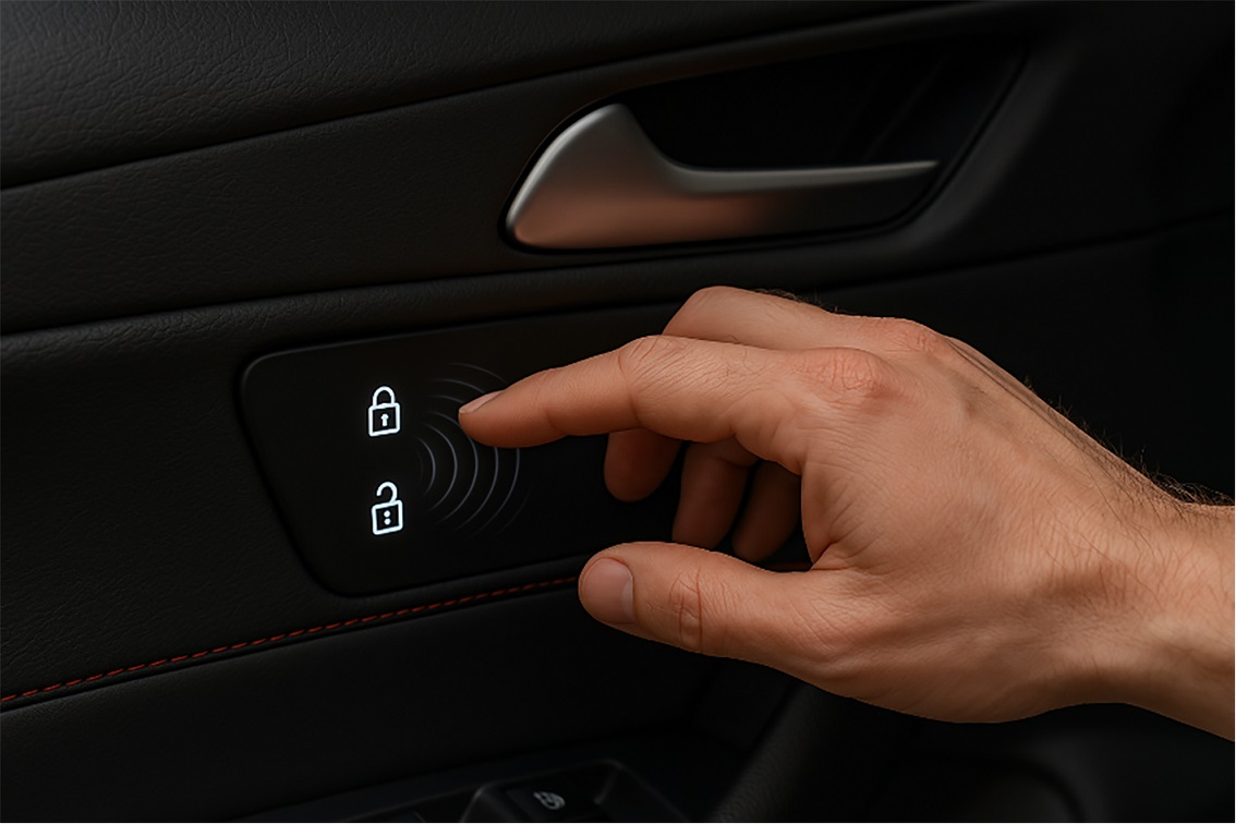当下的车载交互越来越追求简洁一体化,但用户依然期望获得可靠的触觉确认。该设计在无缝触控面板背后集成DRAKE马达,用户在锁门或解锁时可感受到清脆的 “点击感”。工程师表示,DRAKE相较传统LRA线性马达提供了更强的纵向反馈,且在非中心位置按压时仍能保持清晰触感,使整体交互更稳定、更精致。