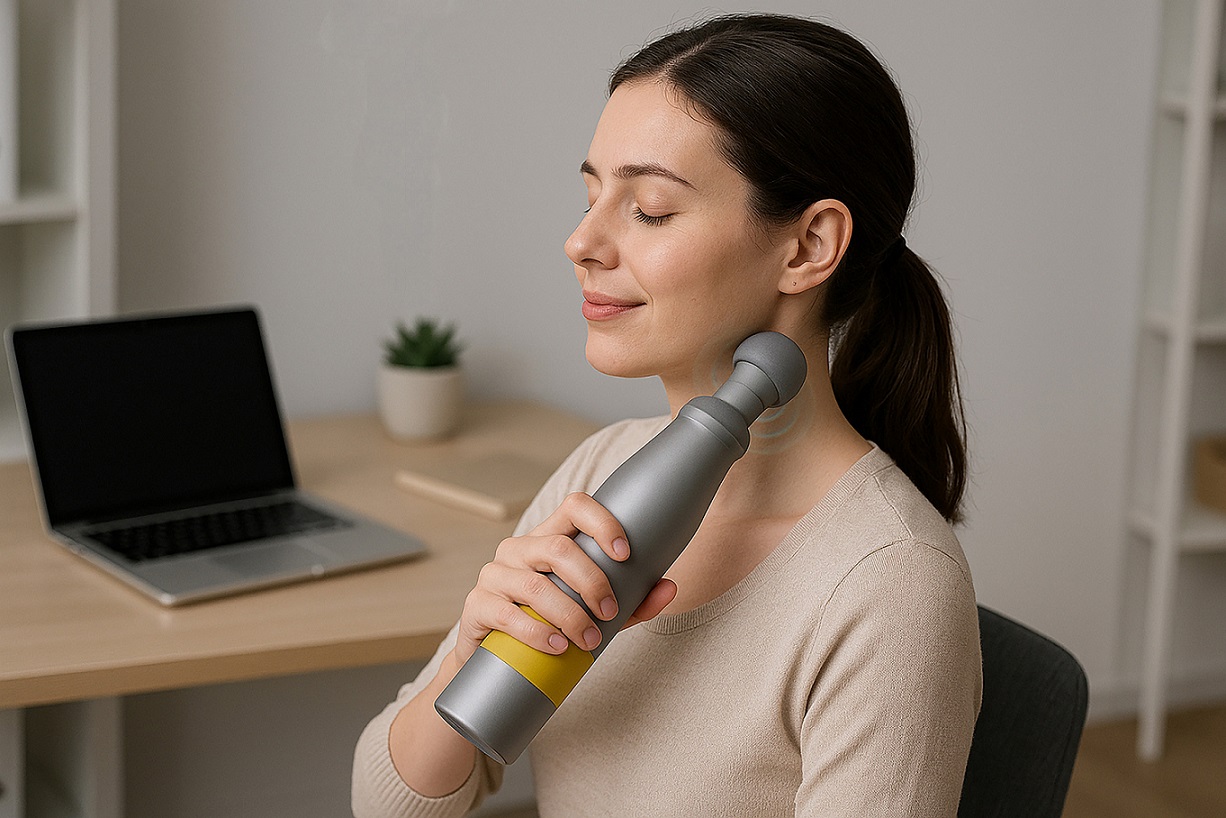 这款二合一设计既是水瓶,也是肩颈按摩器。可拆卸的按摩头内置三颗DRAKE马达,瓶身配备电容感应条。根据手握位置与方式,振动频率和强度自动调整,可快速缓解肩颈疲劳,尤其适合久坐办公人群,无需额外设备即可随时放松。