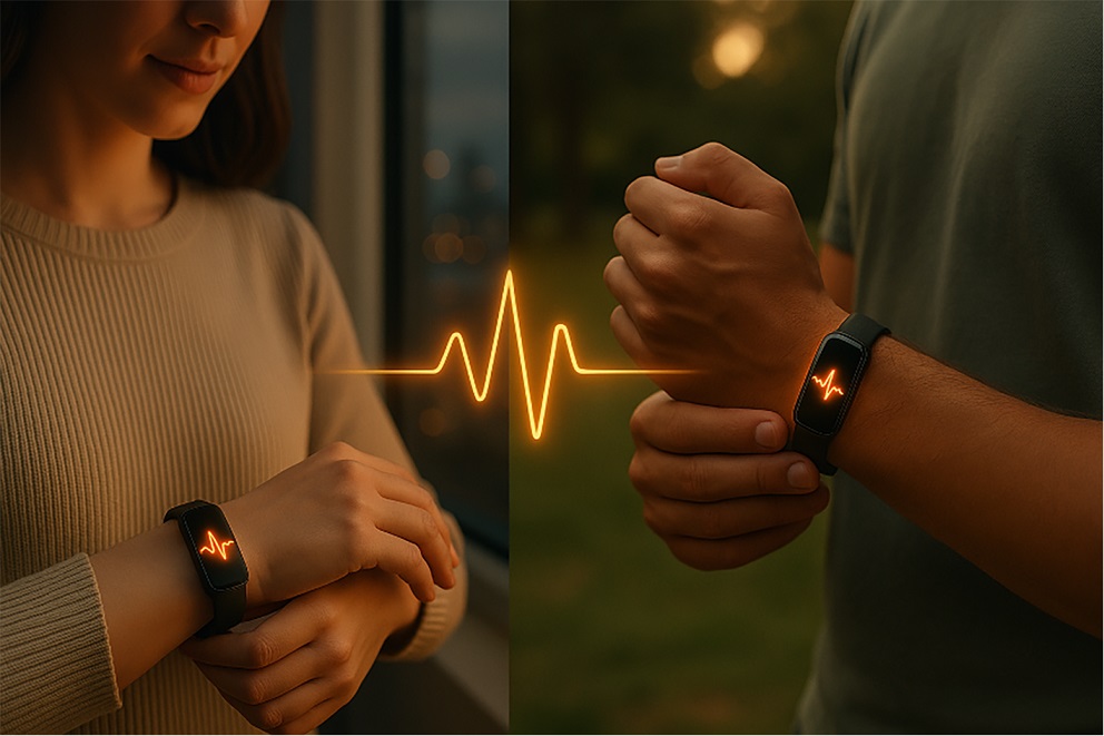 在快速约会场景中,情感表达往往难以启齿。这款手环能将心率转换为低频振动,实现 “无声传情”。当一方心率超过设定阈值,另一方手环会同步振动节奏。两只设备可通过轻触快速配对并实现无线同步,提供了一种安静直观、借助触觉实现的情感传达方式。