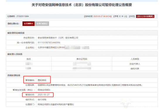 根据相关规定,暂停奇安信网神参加某范围物资工程服务采购活动资格,暂停时间自2025年05月27日起,其法定代表人冯新戈控股或管理的其他企业也被暂停参加上述范围采购活动。