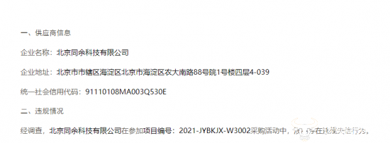 搜索发现,北京同余科技有限公司也因在同一项目中违规失信,被暂停参与上述范围采购活动的资格。这两家公司有啥关联,就不清楚了。