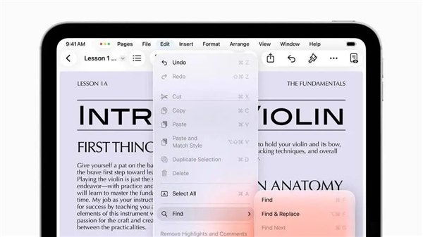 同时,iPadOS 26还引入了macOS中的顶部菜单栏,用户可以通过从显示屏顶部向下滑动或将光标移动到顶部来访问应用程序中可用的命令。值得一提的是,在这个菜单栏中,用户可以使用搜索功能,快速找到应用程序中的特定功能或相关提示。
