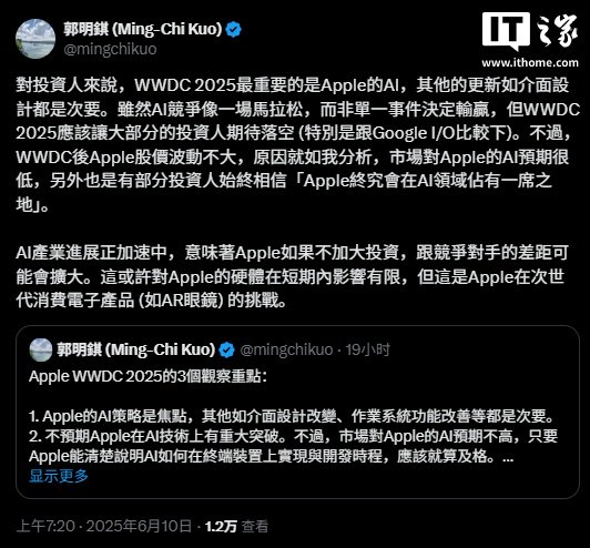 郭明錤表示,不过,WWDC 后苹果股价波动不大,原因就如其分析,市场对苹果的 AI 预期很低,另外也是有部分投资人始终相信“苹果终究会在 AI 领域占有一席之地”。