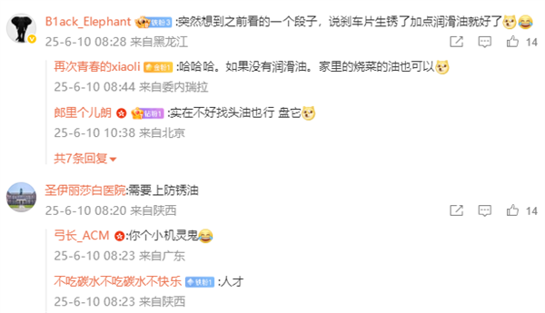 还有网友幽默表示:突然想到之前看的一个段子,说刹车片生锈了加点润滑油就好了。
