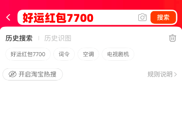 每天都可以通过红包口令领取一次,下次领取只需要再次打开手机淘宝或天猫APP,点击搜索框,找到历史搜索记录里的红包领取口令【 好运红包7700 】,搜索进入2025年淘宝天猫618官方活动红包领取入口,就有机会得最高25888元超级红包,叠加618官方立减、补贴券、88VIP会员、优惠券等优惠力度会更大。