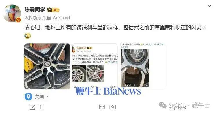 今日,陈震截图该小红书文章的界面,并在他的个人微博对此事进行解释。陈震称地球上所有的铸铁刹车盘都这样,包括他之前的库里南和现在的闪灵。