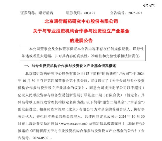 投资界-解码LP获悉,昭衍新药发布公告,公司以不超过1亿元投资参与服务贸易创新发展引导基金二期(有限合伙)(暂定名,简称“服贸二期基金”) 的发起设立,近日,公司全资子公司北京昭衍管理科技有限公司与招商局资本管理(北京)有限公司及其他合伙人共同签署了《合伙协议》。