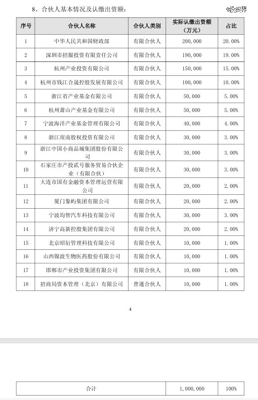 基金认缴出资额为100亿元,主要经营场所位于杭州市萧山区,存续期限最长为15年,招商局资本(北京)作为基金管理人向合伙企业提供投资管理服务。