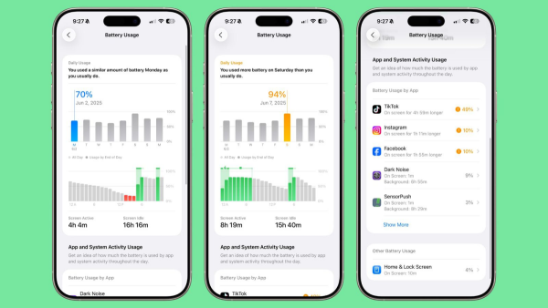 在一众争议中,iOS 26的电池功能更新显得格外务实。苹果重新设计了设置中的电池界面,用户现在可以更直观地看到当前电量、上次充电时间,以及充电时“距离充满还剩多久”的实时倒计时。另外,新功能会清晰展示iPhone使用习惯(如屏幕亮度、后台应用)如何影响电池健康,甚至细化到每个应用的耗电占比;全新的电池管理工具还允许用户自定义 “耗电黑名单”,对高功耗应用一键限制后台活动。