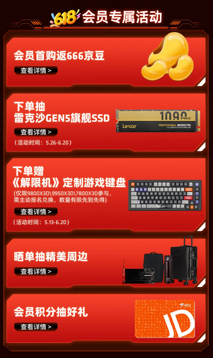 AMD京东自营旗舰店618大促今天正处于“AMD会员日”阶段,所以重点当然是要来详细介绍一下AMD京东自营旗舰店会员们可以享受到的福利。首先建议大家成为AMD京东自营旗舰店的会员之后再来选购自己心仪的商品,加入会员可以抽取周边好礼,会员首购就返666京豆,累积的积分还能再抽壕礼。活动期间所有用户下单组装机产品可以领取每满999-30的优惠券,还可以参与评价晒单返京东E卡;下单还能抽雷克沙GEN5旗舰SSD,参与《解限机》游戏键盘兑换活动,活动礼品数量有限,先到先得。(每项活动都限指定型号,请朋友们看清楚下单规则,更多详细活动信息请以页面显示为准)。